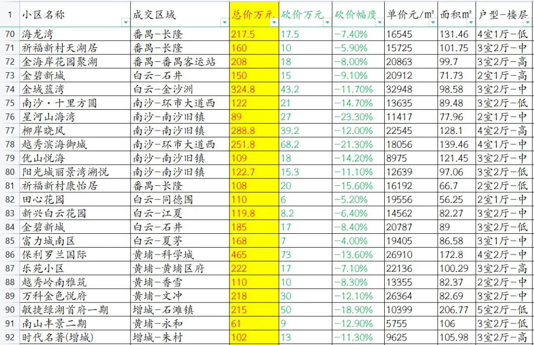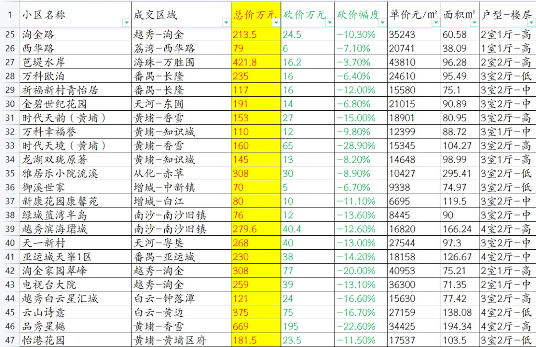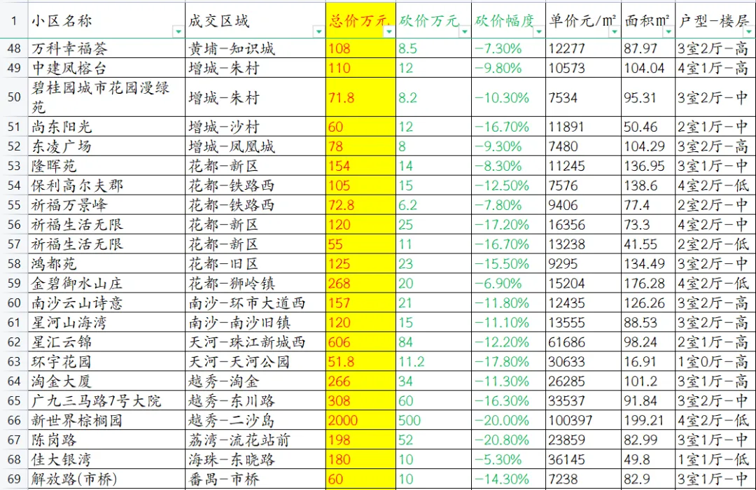 数据详情请查看图片,其中总价代表真实成交价,砍价万元+总价万元=挂牌价。