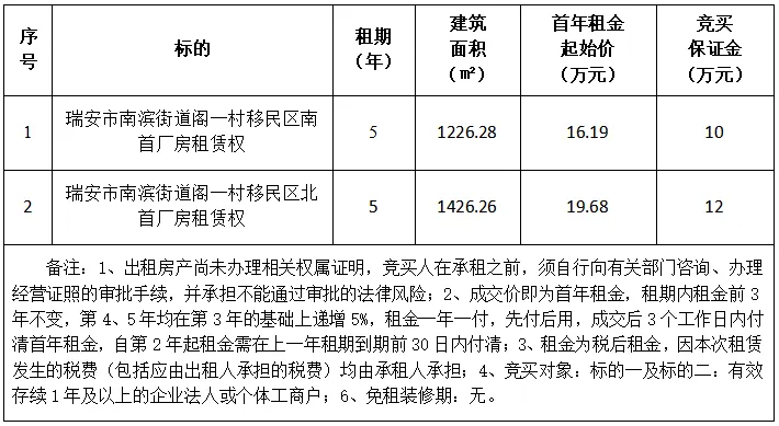 瑞安市南滨街道阁一村移民区部分房产租赁权拍卖预公告
