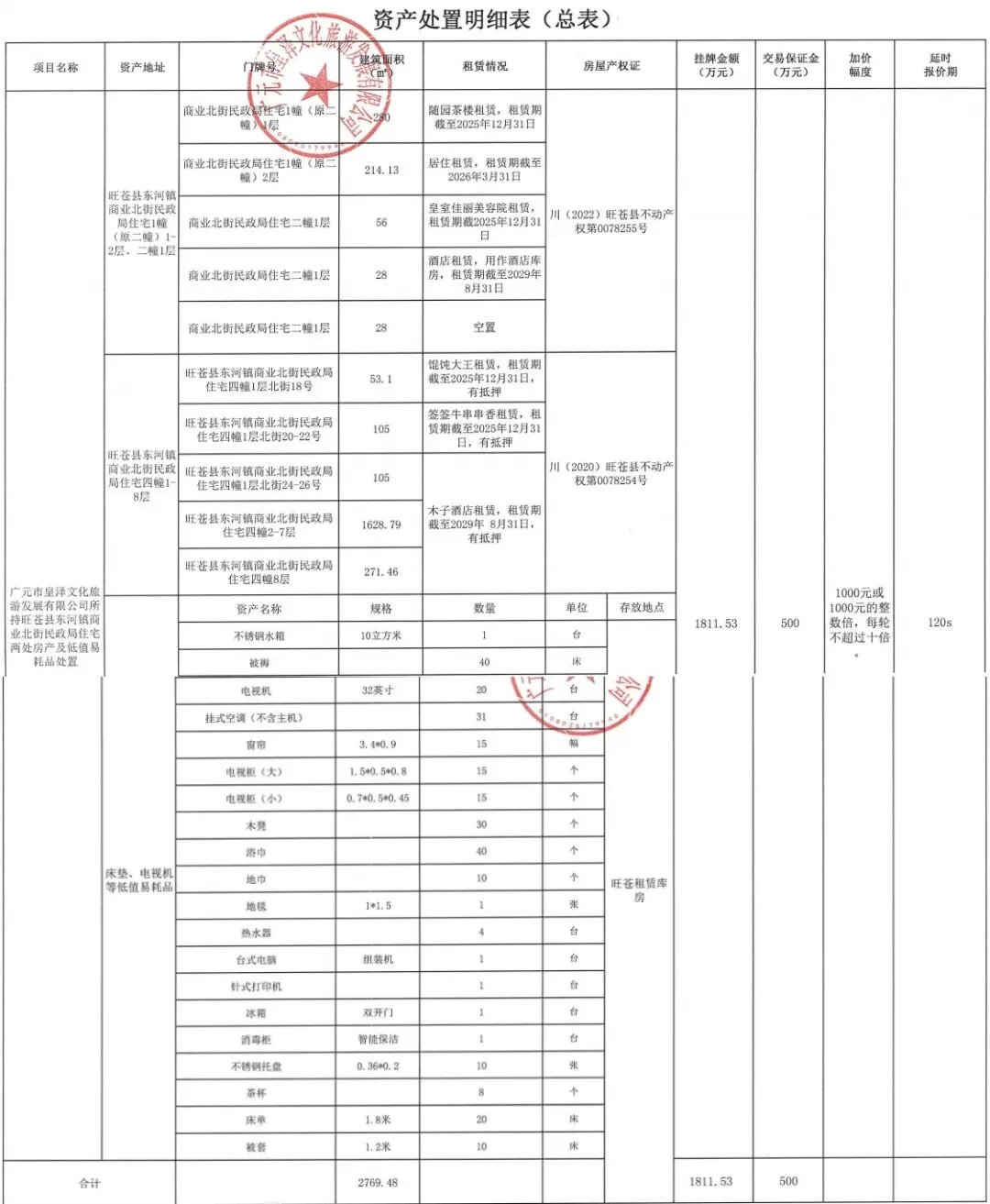 广元市皇泽文化旅游发展有限公司所持旺苍县东河镇商业北街民政局住宅两处房产及低值易耗品处置