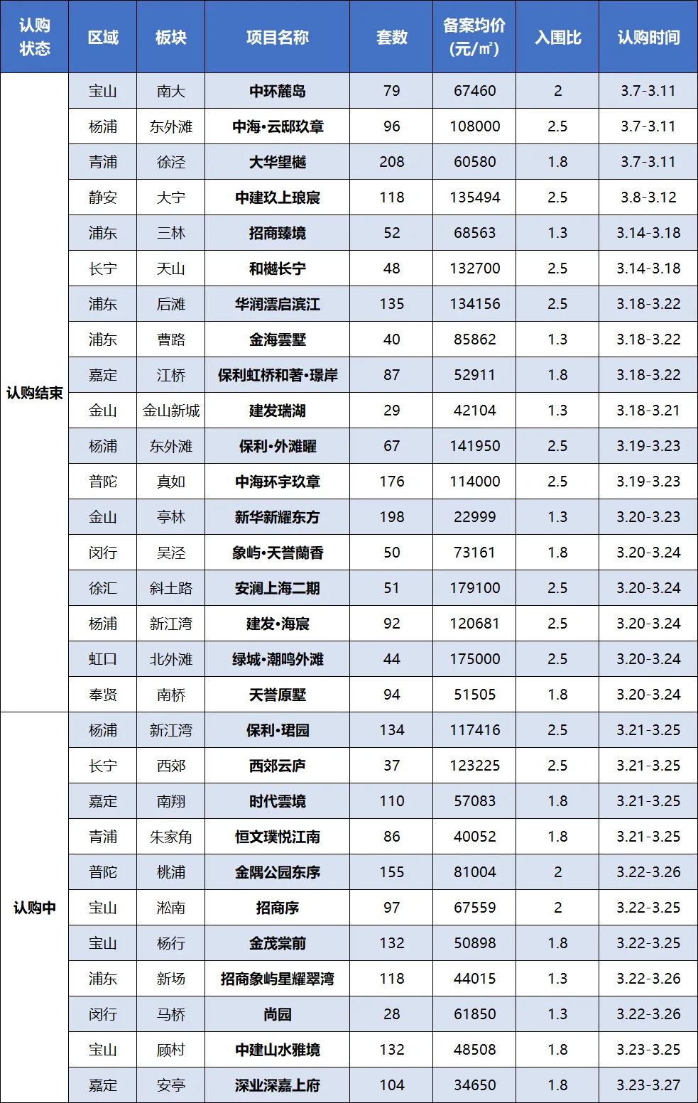 认购方面, 3月至今上海共有29个楼盘认购,上周认购迎来供应高峰,一周内共有21个楼盘集中启动认购。