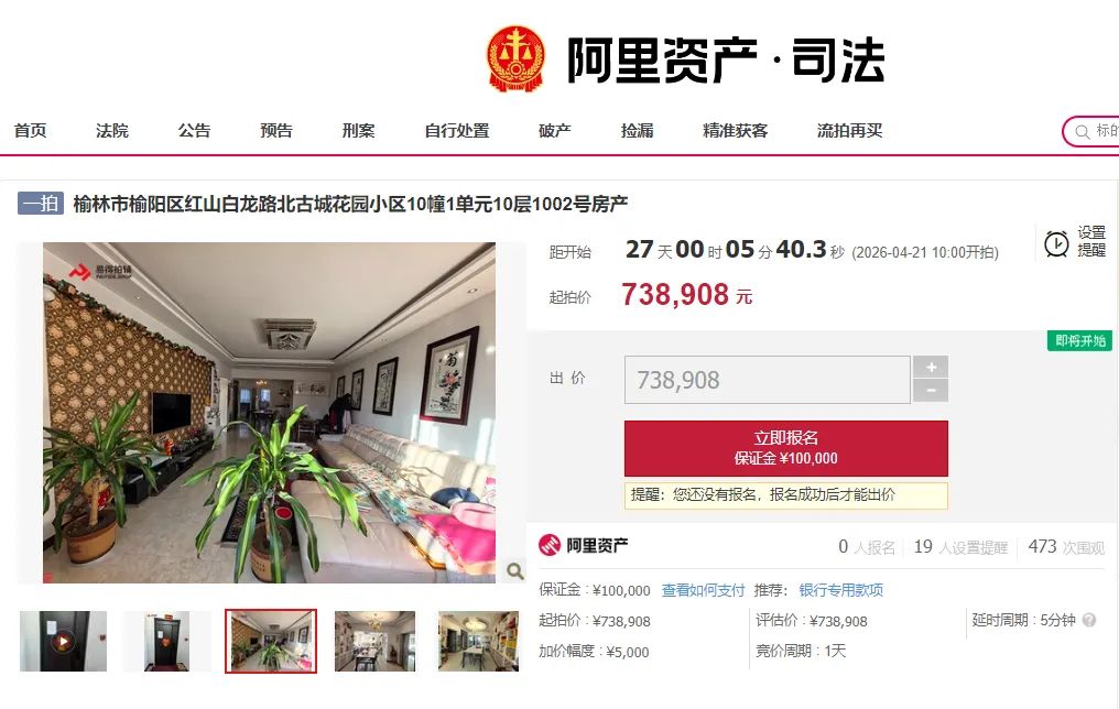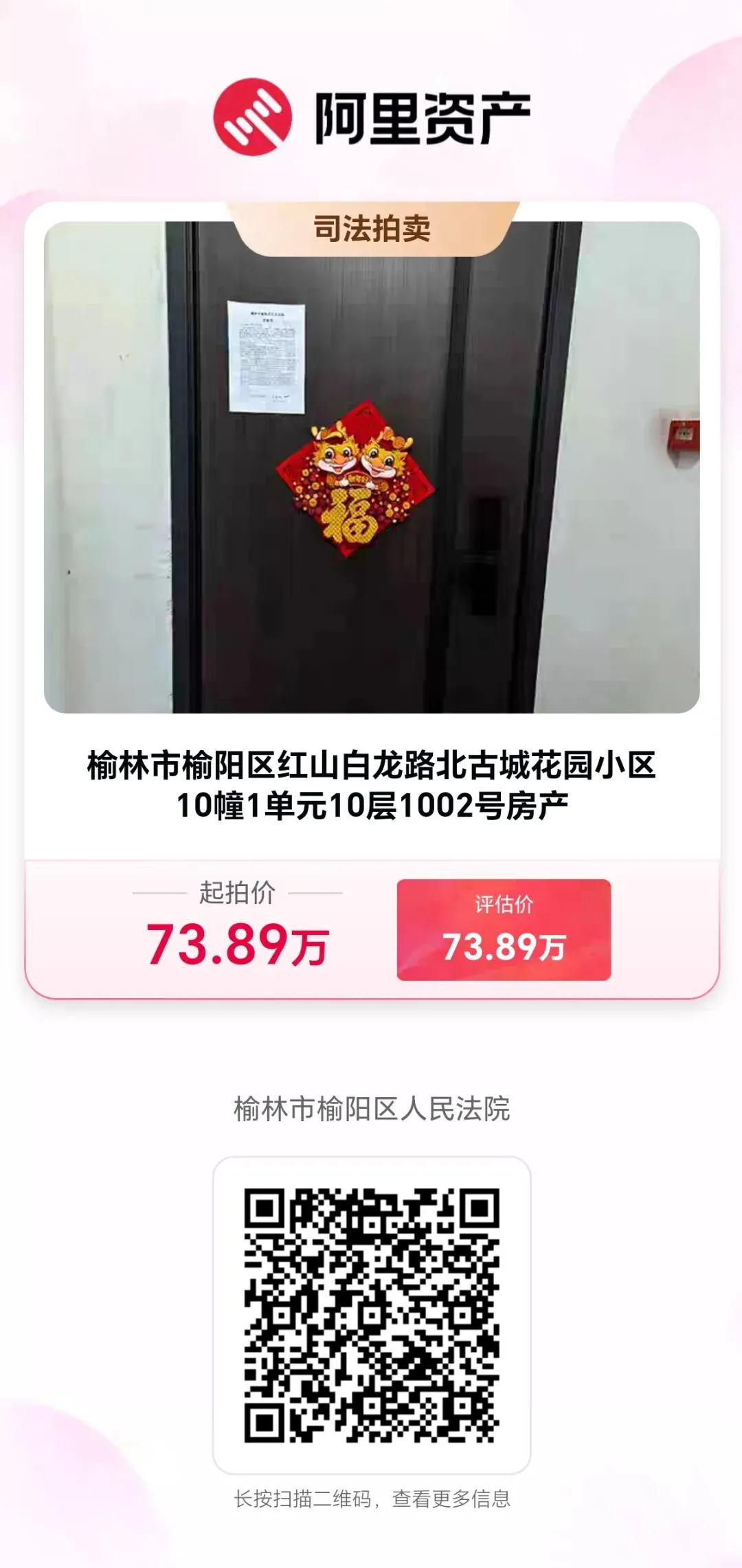 4月21日10时至22日10时,榆阳法院将在淘宝网司法拍卖平台上,拍卖榆阳区古城花园小区房产,73万元起拍!