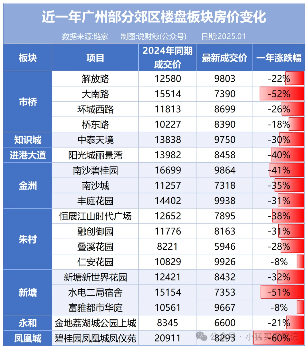 增城、南沙、黄埔等远郊区域,部分小区跌幅达40%-51%,首付几乎被跌没。