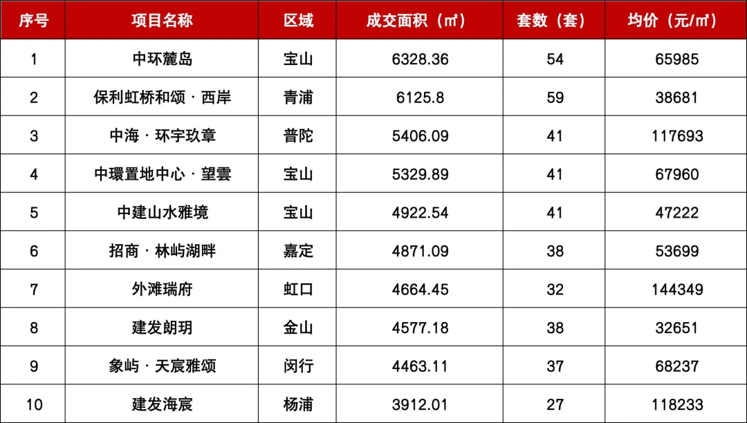 成交端同样表现活跃。数据显示,中环麓岛以54套、6328㎡的成交量位居近期成交前列,均价约6.6万元/㎡。青浦区的保利虹桥和颂·西岸也录得59套成交,均价约3.87万元/㎡,承接了大量外溢刚需及新上海人置业需求。