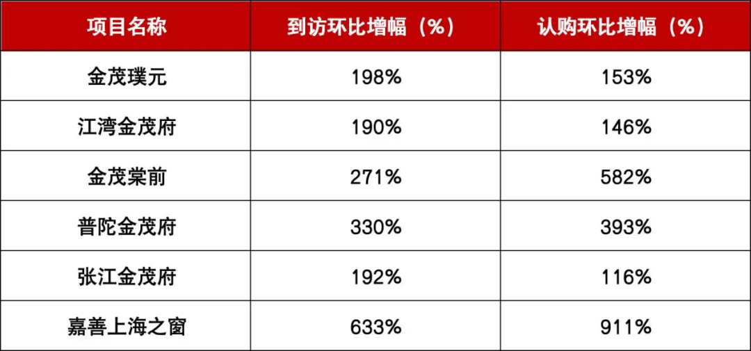 江湾金茂府到访环比增长190.11%、认购增长146%,凭借中环旁TOD优势精准承接新政释放的改善需求;金茂棠前到访环比增长271.43%、认购增幅高达582%,持续领跑北上海市场。