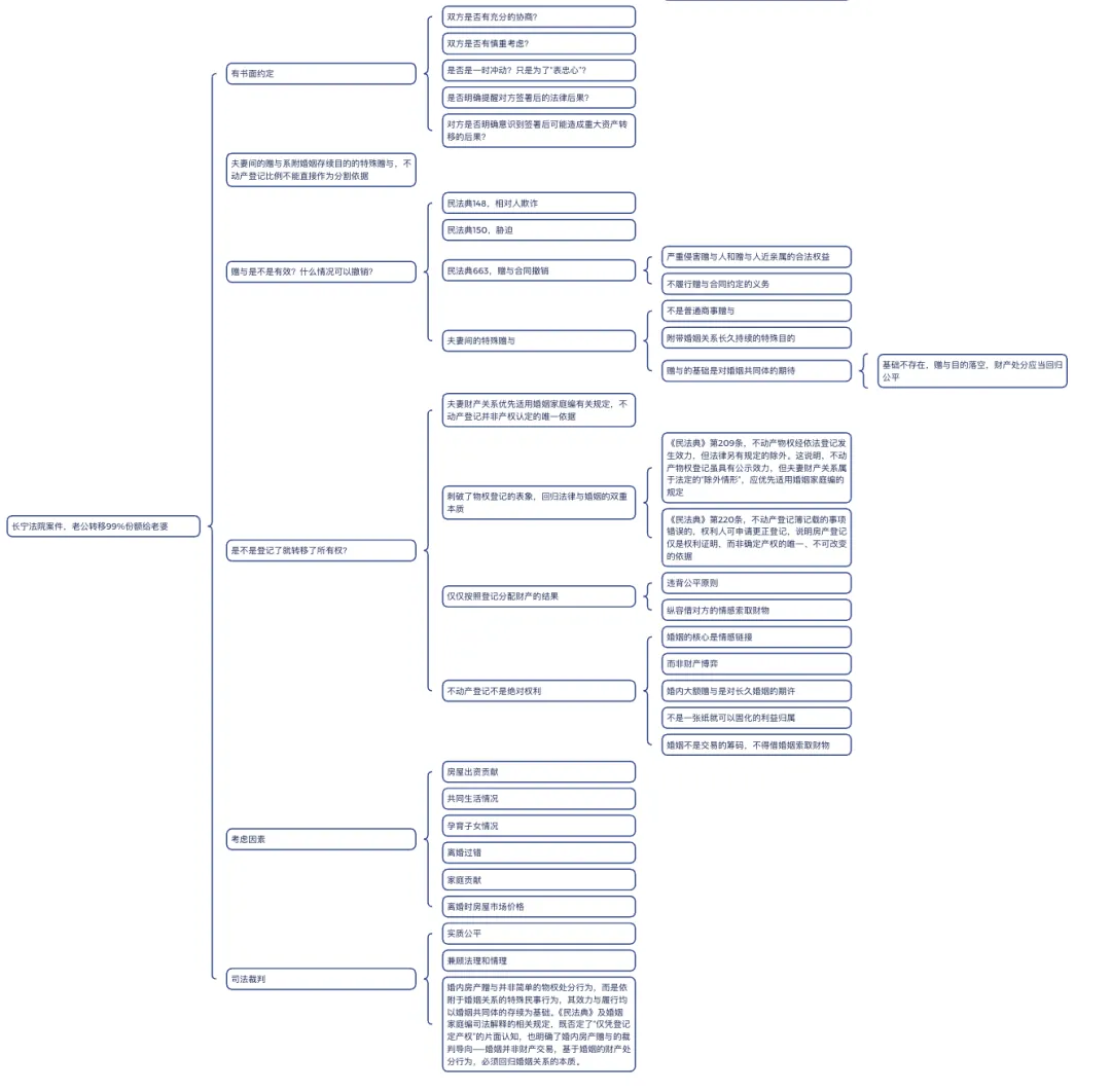 本案的核心争议在于:夫妻一方基于婚姻关系将房产99%份额赠与另一方并完成登记,婚姻短暂破裂后,该赠与是否有效?不动产登记的比例能否作为离婚财产分割的唯一依据?结合《民法典》及相关司法解释,从法律原理、裁判规则两方面展开分析: