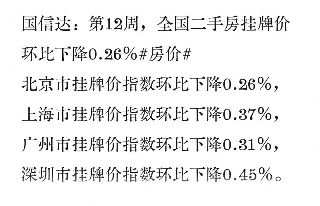 >第12周全国二手房挂牌价环比跌0.26%
