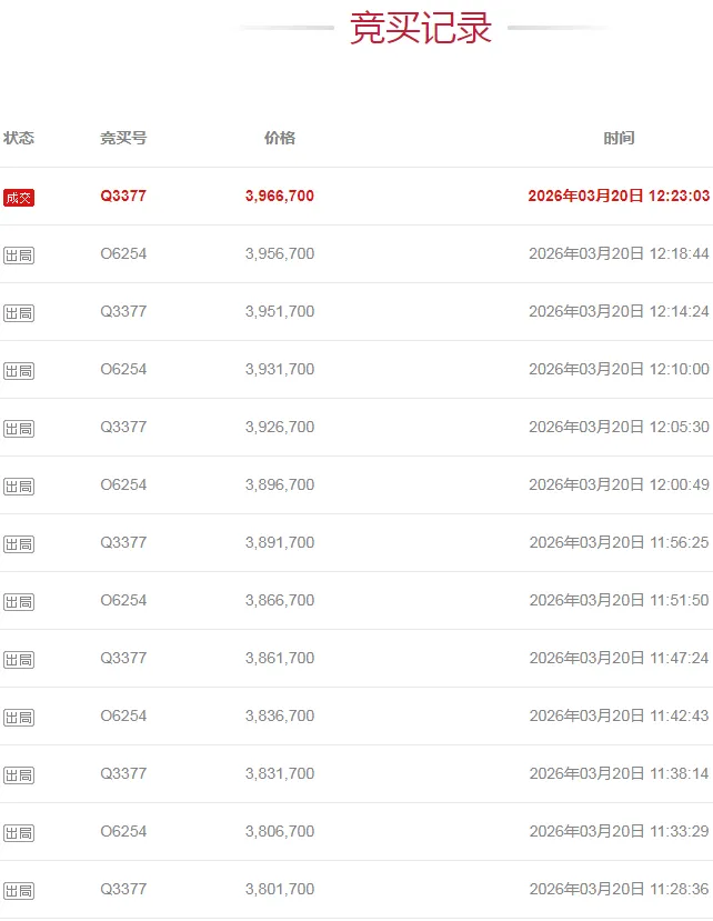 起拍价3206700元,本次拍卖活动共有8人报名参加,经过118轮激烈竞价,最终以3966700元成交,溢价760000元。