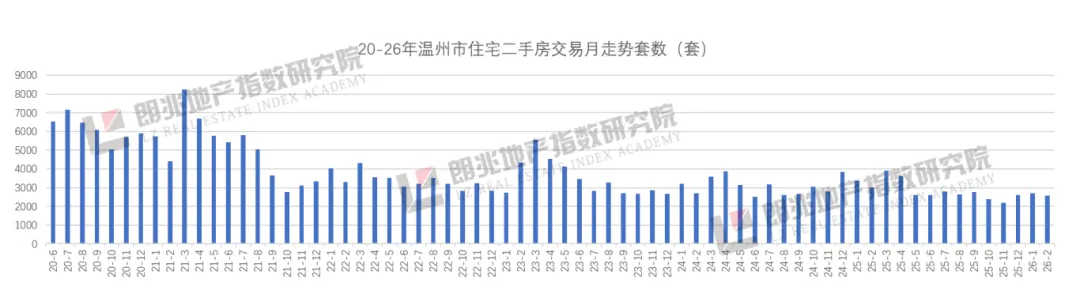 2020年6月-2026年2月,温州全市二手房单月成交峰值出现在2021年3月,单月网签超8000套。从走势图看出,单月破7000套都比较少见,单周(起码当下)动动脚指想都不可能。