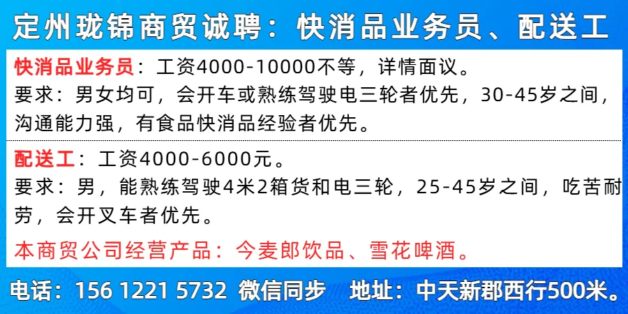 岗位四:市内业务员10名岗位职责:定州市区快件派送岗位要求:20-45周岁以下,能熟练驾驶三轮电动车,有责任心,吃苦耐劳,有从业经验优先考虑,工资4000-8000元;电话:18632289573