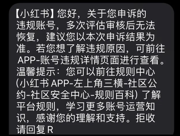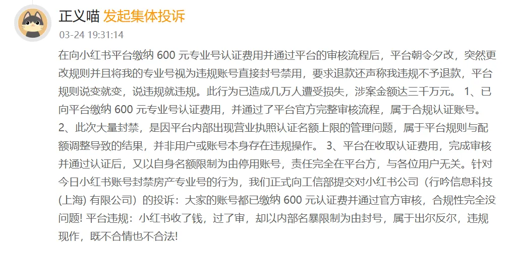 截至3月26日(事件爆发后两周),小红书官方未就此次房产经纪人批量封号、拒退认证费事件,发布任何正式、完整的公开声明。平台通过系统通知和客服,给出的唯一官方理由是: