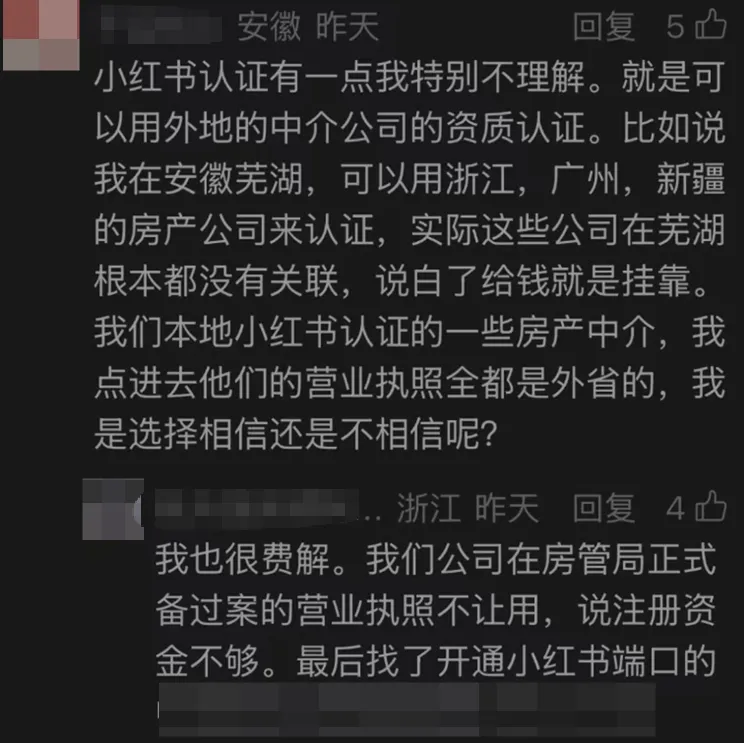 “小红书认证有一点我特别不理解。就是可以用外地的中介公司的资质认证。比如说我在安徽芜湖,可以用浙江、广州、新疆的房产公司来认证,实际这些公司在芜湖根本都没有关联,说白了给钱就是挂靠。”