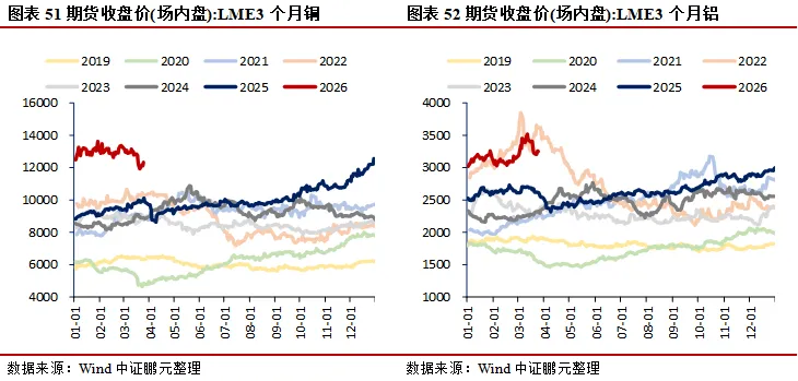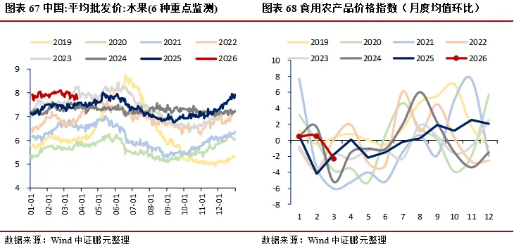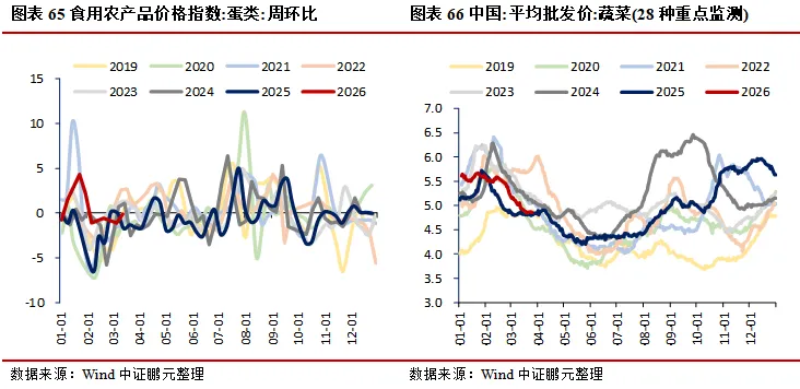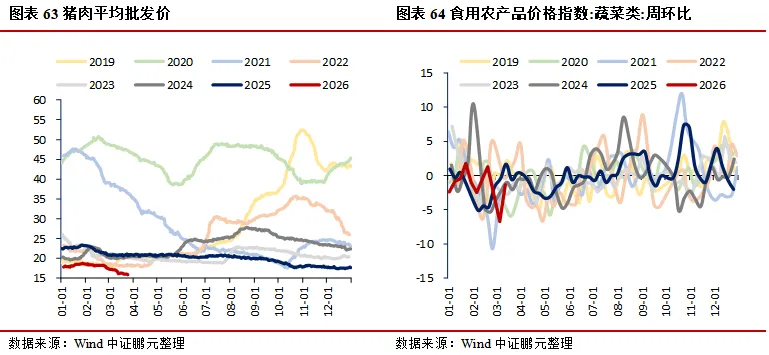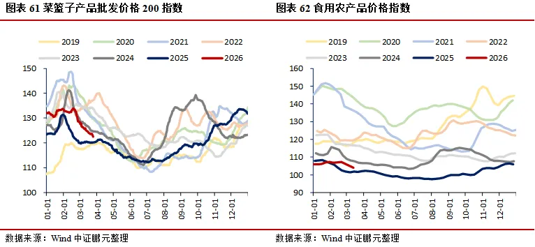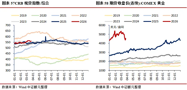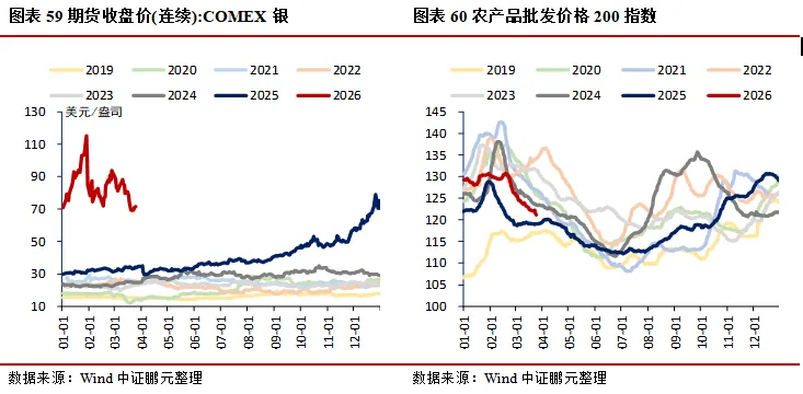 价格:生产端工业品多数微降,南华工业品指数环比下降0.23%,南华综合指数环比下降1.62%;水泥价格指数环比上升0.12%,建材综合指数环比上升0.04%;上海螺纹钢、热轧板卷价格分别环比下降1.53%、0.90%,环渤海动力煤价格环比上升0.15%;能源方面,布伦特原油期货价、现货价分别环比下降4.81%、2.43%,焦煤期货价环比上升6.05%;金属方面,LME3个月铜、铝、锌期货收盘价分别环比下降0.60%、4.63%、1.72%;PTA华东地区市场价环比上升1.57%,涤纶长丝(POY)、涤纶长丝(DTY)华东地区市场价分别环比下降0.38%、上升0.28%;CRB现货指数综合环比下降0.25%。居民端价格回落,农产品批发价格200指数、菜篮子产品批发价格200指数分别环比下降0.94%、1.08%;猪肉、蔬菜(28种重点监测)、水果(6种重点监测)平均批发价分别环比下降2.35%、0.41%、1.65%。贵金属延续走弱,COMEX黄金、银期货收盘价分别环比下降5.69%、4.89%。