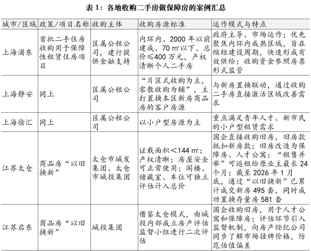 5.政策持续迭代与人性化设计。各地在推进过程中均注重根据市场反馈持续优化政策。太仓模式已进行多轮迭代:从“一套换一套”升级为“多套换一套”;旧房抵扣比例从60%提升至80%;增加阁楼、储藏室、车位等独立评估纳入总价;创新“学区保留两年”政策。这些优化措施有效回应了居民的实际关切,提升了政策接受度。收购二手房用作保障性住房这一模式的推广,对房地产市场的供需结构、资源配置以及保障房体系建设均产生了深远的市场意义,具体体现在以下三个层面:1.盘活市区存量二手房,优化城市资产配置。老旧城区的二手房长期面临流动性不足、议价能力弱的困境,尤其是一些建成于2000年以前的老旧房源,受限于房龄、户型结构及贷款限制,在二手房市场中的交易周期明显长于次新房。地方国企以官方主体介入收购,为这类房源提供了稳定的退出渠道。一方面,此举直接改善了市区老旧房源的流动性,避免了部分房源因长期滞销而出现价格非理性下跌,对稳定二手房市场价格预期具有托底作用。另一方面,收购后的房源经过改造转化为保障性租赁住房,使原本散落在成熟区域的存量资产被重新盘活,避免了城市核心区住房资源的闲置浪费。从城市更新的视角看,这种模式以“微更新”替代大规模拆建,保留了成熟社区的居住功能与社会网络,降低了城市更新的综合成本。