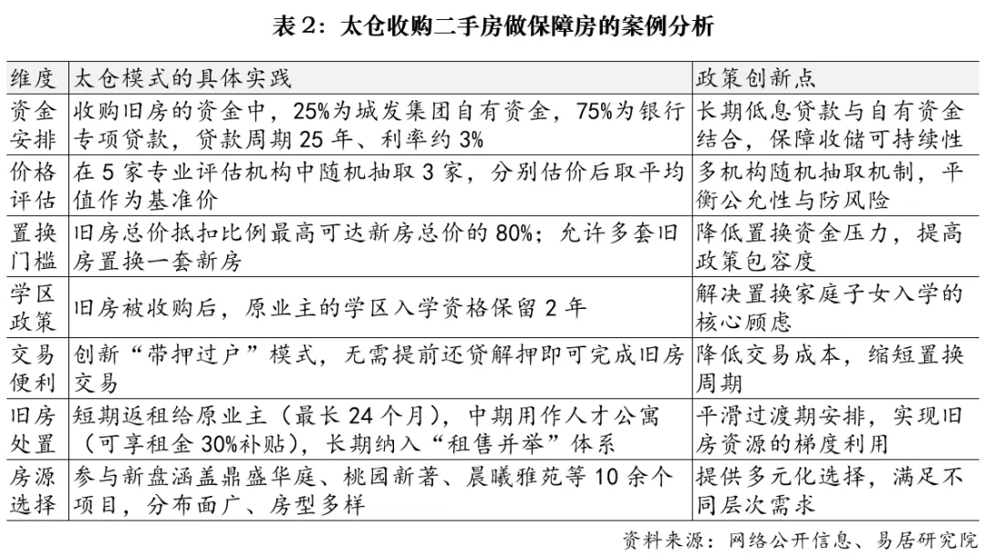 早期的收储实践主要集中在收购房地产开发企业的未售新建商品房,由地方国企作为收购主体,获取银行贷款或专项债支持,将其转化为保障性租赁住房或配售型保障房。而当前,以上海、杭州、济南、太仓等城市为代表,收购对象开始从“新房库存”延伸至“二手房市场”。这一转变意味着政策工具正在覆盖更广泛的存量资产,通过为老旧二手房提供“官方退出通道”,直接激活住房置换链条,同时以较低成本快速筹集位于成熟区域的保障性房源。截至目前,全国已有多个重点城市及区域发布或实施了收购二手房用作保障性住房的具体方案。各城市在收购主体、房源标准、操作模式上呈现出一定的差异化特征,具体案例汇总如下:太仓市作为全国率先试行商品房“以旧换新”政策的地区之一,其模式在长三角乃至全国具有示范效应。该市自2023年9月底启动试点,当前收购旧房和置换新房的数量总体不错。太仓模式的创新性与成熟度体现在以下几个维度:太仓模式的成功实践表明,收购二手房与激活新房市场可以实现深度联动。太仓城发集团明确将“筹集1万套人才公寓和保障房”作为企业KPI,收购旧房成为达成这一目标的重要补充渠道。通过收购旧房,不仅盘活了老城区的存量资产,也为新城区的新房项目导入了有效需求,形成了“老房有人住、新房有人买”的良性循环。