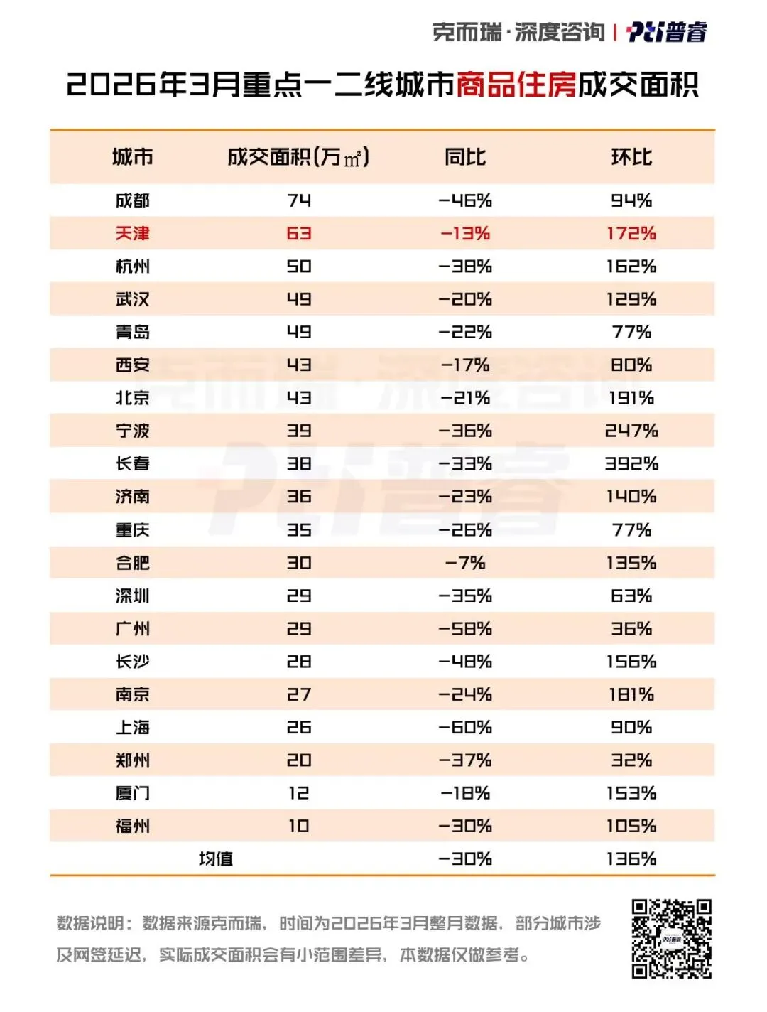 据克而瑞、中指研究院等机构监测数据显示,2026年3月全国新房市场虽环比有所回暖,但同比降幅显著,未达传统旺季预期。