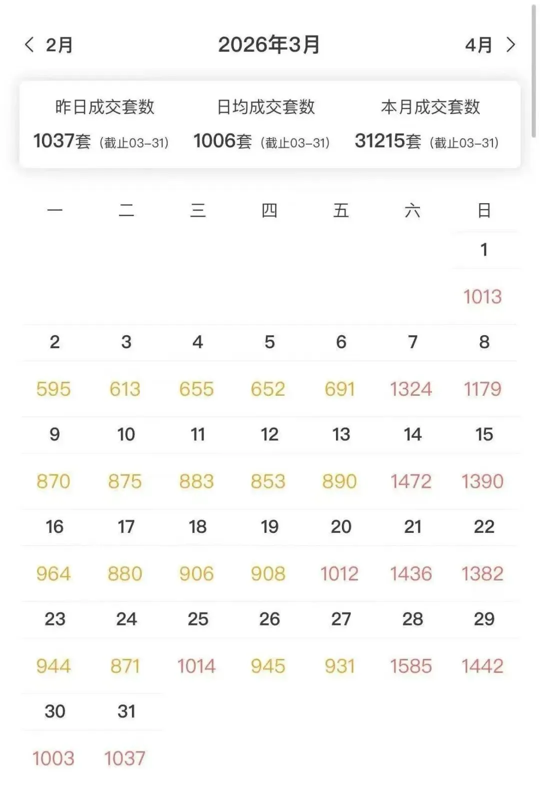 • 日均成交1006套,整个3月市场热度持续在线,没有出现明显的冲高回落;