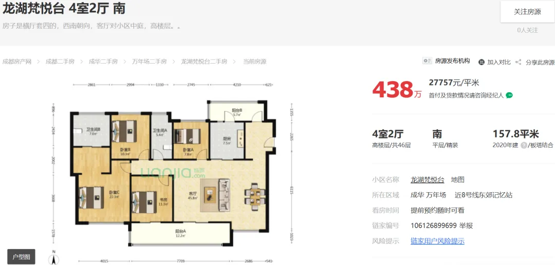 2026年03月06日,【那坊归心】成都龙泉驿东安湖存量房(二手房)朗基紫境东来建面138平套四报价189万,是否适合90后?