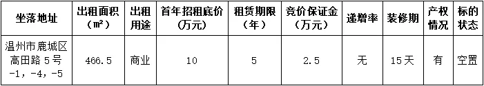 2.竞得人须在成交之日起5个工作日内将首期租金及履约保证金足额缴至温州联合产权交易中心账户(户名:温州联合产权交易中心有限公司,账号:756000120190008655,开户行:温州银行总行营业部);并在规定时间内同出租方签订租赁合同。