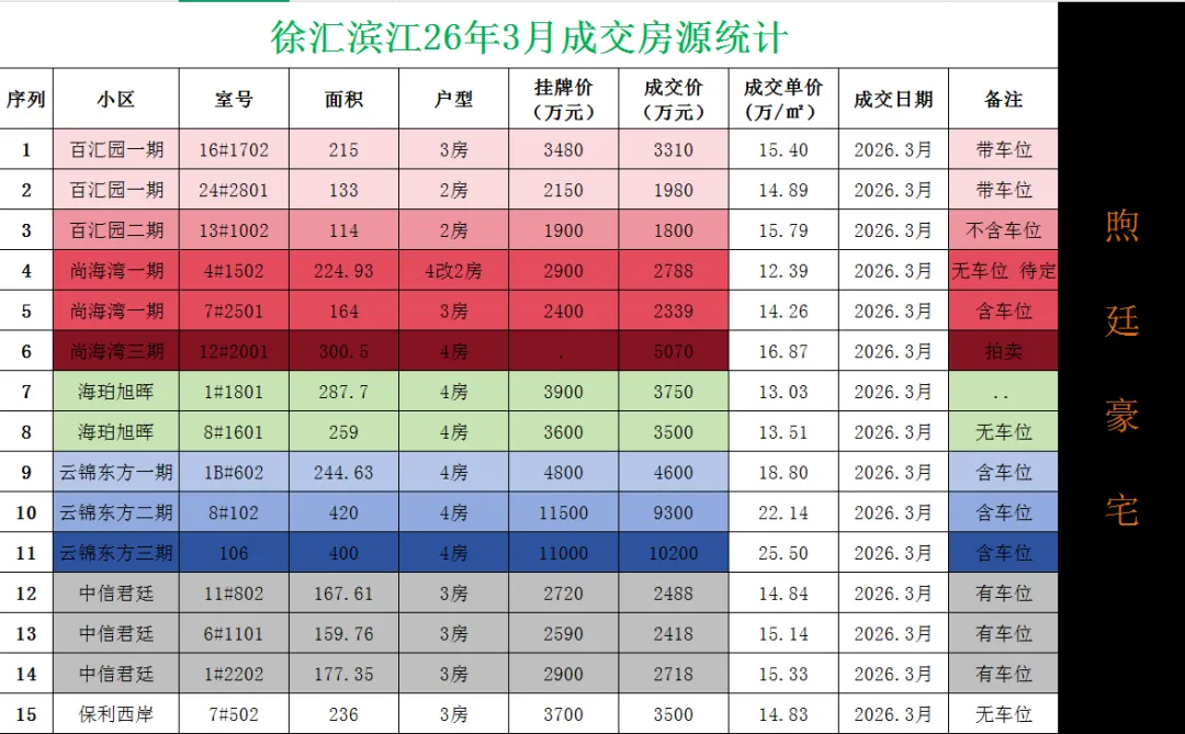 徐汇滨江3月共成交15套二手房大宅(3月成交统计)
