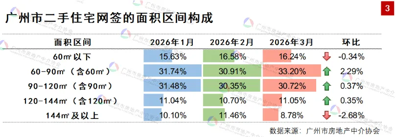 从成交面积区间构成来看,广州二手房市场需求结构特征鲜明,刚需与改善型需求成为市场主力,其中改善型需求呈现较快释放态势。