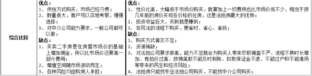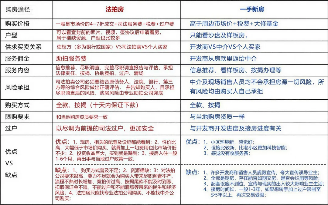 我们购买房子的基本要素主要是购买的价格,户型选择,相关服务佣金,购买资格等优势大家可以通过以下两个表格了解一下购买法拍房与购买一手新房,传统二手房的差别。