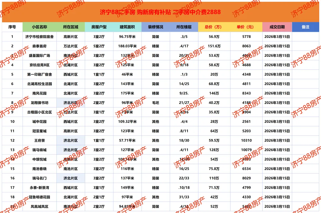 济宁二手房成交市场价参考|3月15日