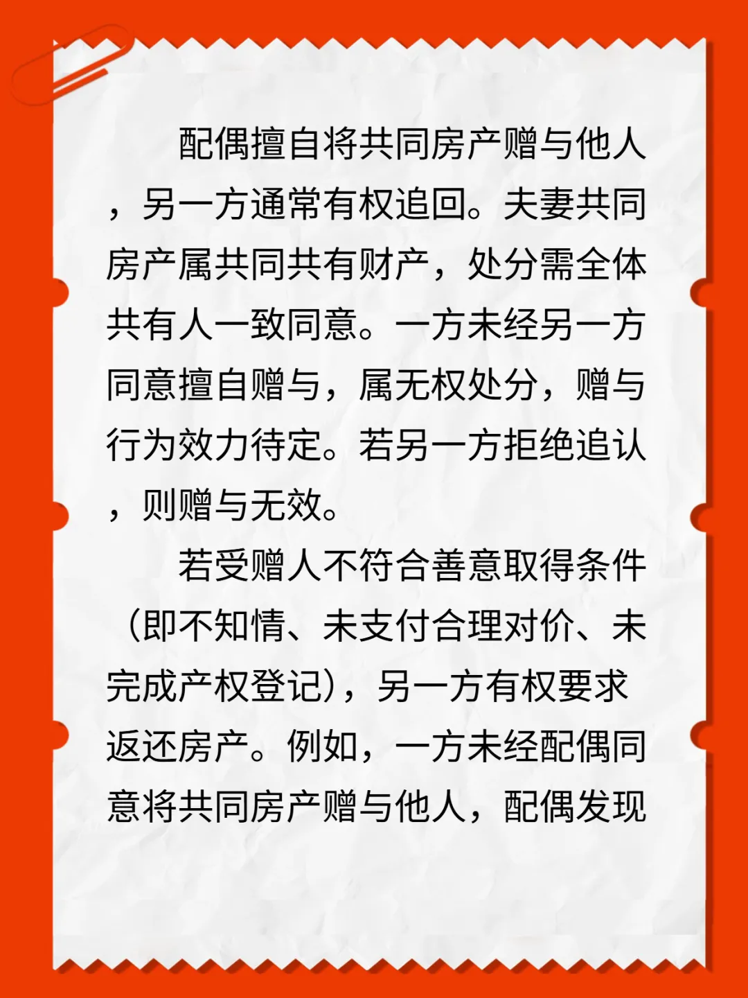 配偶擅自将共同房产赠与他人,另一方通常有权追回。夫妻共同房产属共同共有财产,处分需全体共有人一致同意。一方未经另一方同意擅自赠与,属无权处分,赠与行为效力待定。若另一方拒绝追认,则赠与无效。