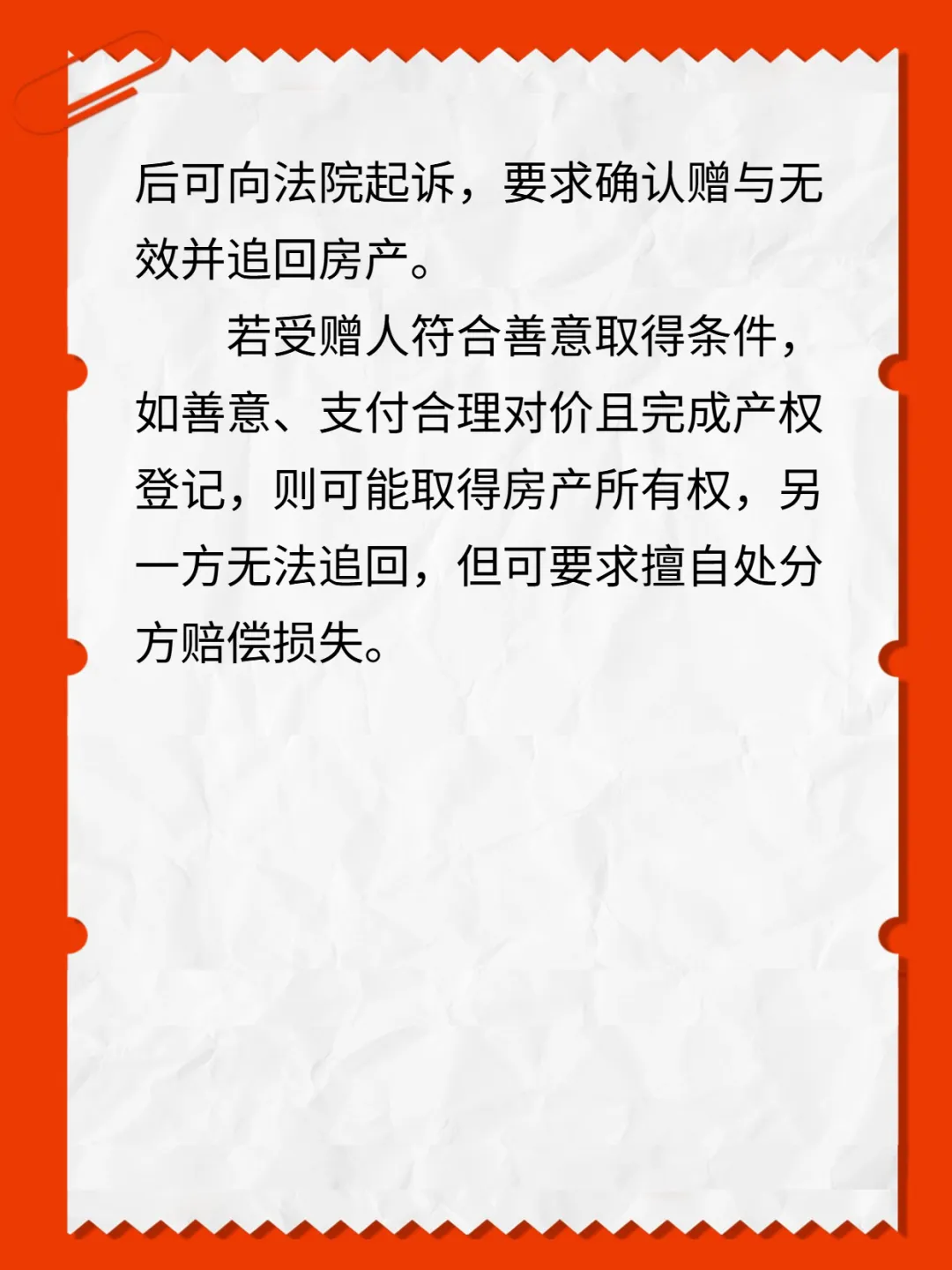 若受赠人不符合善意取得条件(即不知情、未支付合理对价、未完成产权登记),另一方有权要求返还房产。例如,一方未经配偶同意将共同房产赠与他人,配偶发现后可向法院起诉,要求确认赠与无效并追回房产。