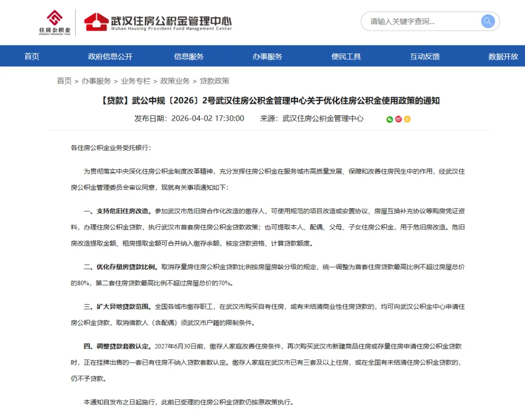 2026年4月2日,武汉住房公积金管理中心发布《武汉住房公积金管理中心关于优化住房公积金使用政策的通知》(【贷款】武公中规〔2026〕2号),涉及多项重磅变化,本通知自发布之日起施行,此前已受理的住房公积金贷款仍按原政策执行。一、支持危旧住房改造。参加武汉市危旧房合作化改造的缴存人,可使用规范的项目改造或安置协议、房屋互换补充协议等购房凭证资料,办理住房公积金贷款,执行武汉市首套房住房公积金贷款政策;也可提取本人、配偶、父母、子女住房公积金,用于危旧房改造。危旧房改造提取金额、租房提取金额可合并纳入缴存余额,核定贷款资格、计算贷款额度。