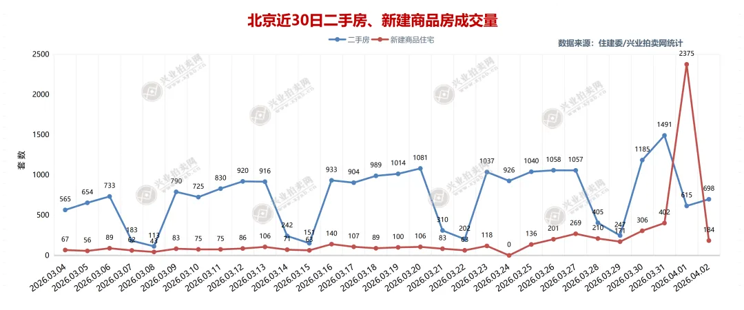 2026年4月2日北京二手房网签成交698套,本月累计网签成交1313套;其中住宅网签成交621套,本月住宅累计网签成交1164套;北京新建商品住宅成交184套,本月累计成交2559套。