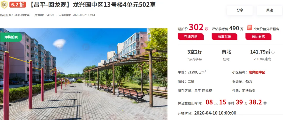 本次拍卖房源为龙兴园中区13号楼4单元502室,建面141.79㎡,3室2厅,格局方正、采光充足,房源状态优质、性价比突出。起拍价302万,评估参考价490万,6.2折,定于2026年4月10日10:00开拍,获取更多房源信息及尽调报告,可联系我们!