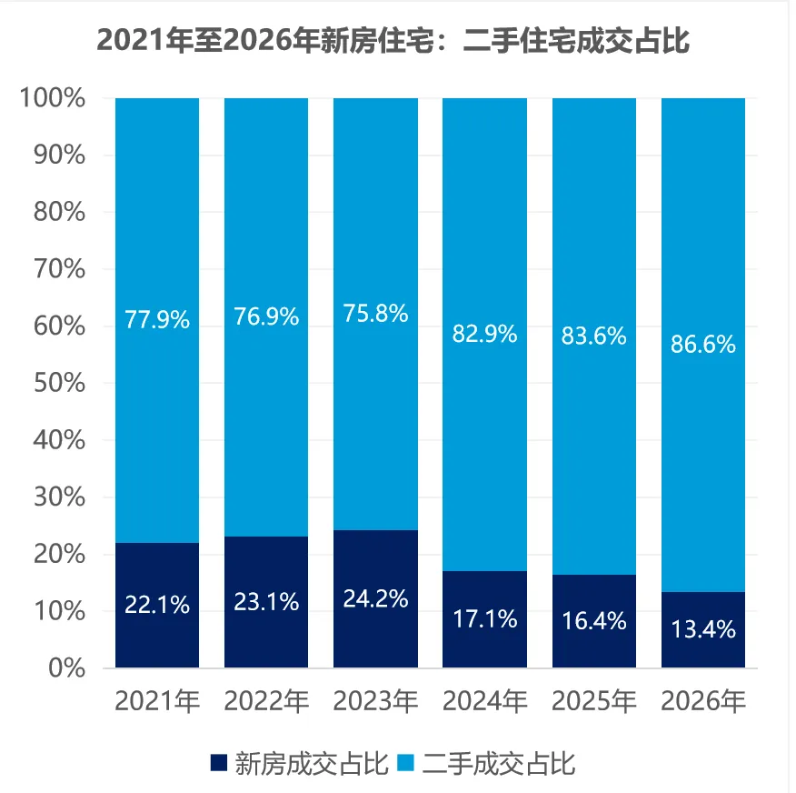 从2024年开始,新房成交占比逐步减少的最主要的原因在于二手房的降幅较大,已经降出了非常明显的性价比,尤其是总价500万以内的刚需房源占比达到70%,新房整体偏刚改和改善,没有价格优势的情况下,占比只能进一步收缩。