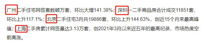 广州3月二手住宅网签破万套,环比大涨141%;上海更是创下近五年新高,单月成交3.13万套;北京逼近2万套大关,创15个月来最高纪录;深圳也环比翻倍,突破5000套。