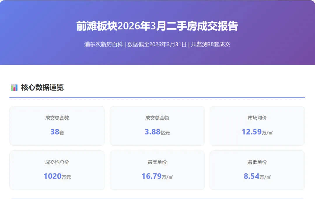 2026年3月前滩板块以38套成交、3.88亿元总金额交出了一份稳健答卷。政策红利释放、利率低位环境、学区刚性需求和季节性旺季四重因素叠加,驱动板块成交量在春季实现有效放量。