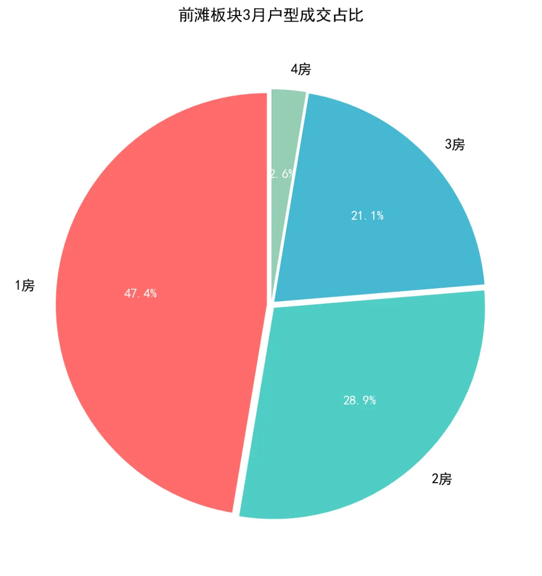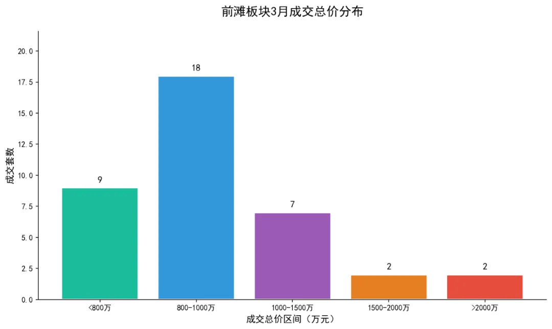 800-1,000万总价段以18套、47.4%的占比构成绝对主流。该区间总价对应的是学区置换买家最容易实现的预算上限,也是前滩板块流动性最佳的价格带。