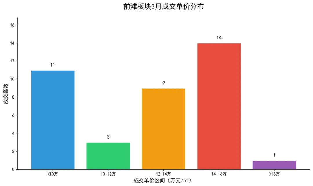 14-16万/㎡区间是本月成交最活跃的价格带,吸纳了36.8%的成交量,这一价格区间恰好对应前滩板块一房产品的市场定价中枢。