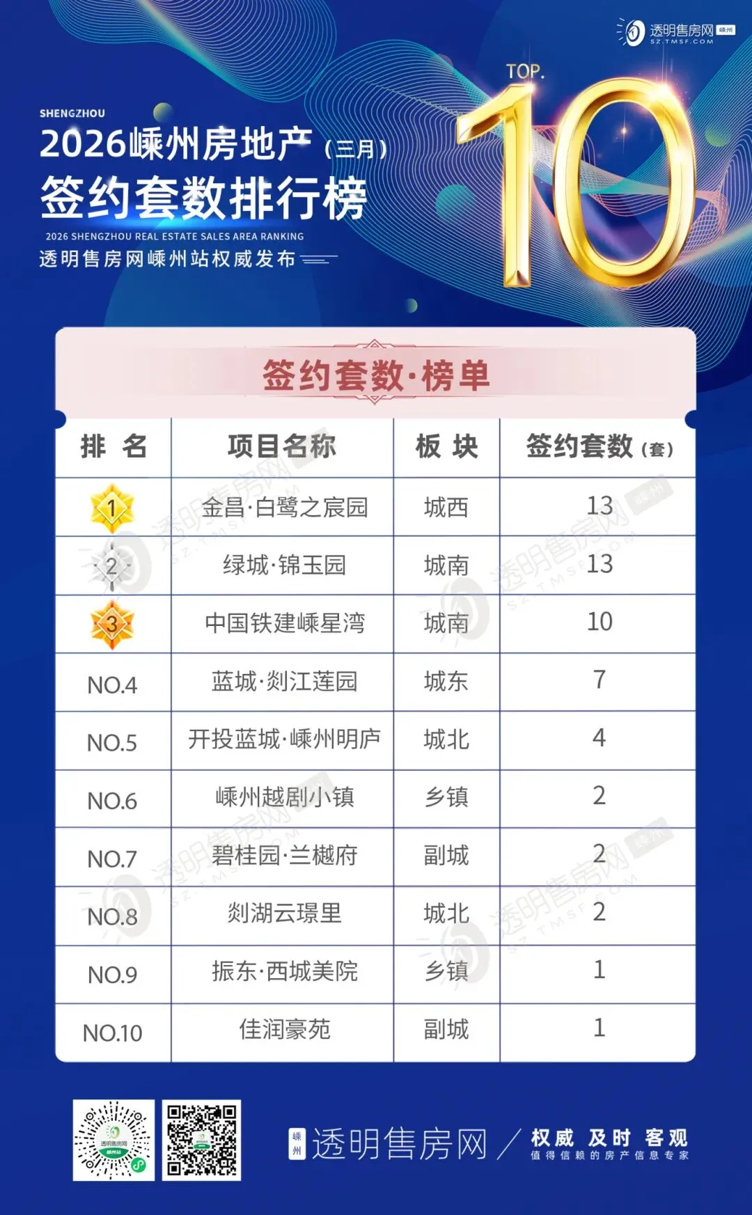 3月嵊州签约套数前三楼盘分别为:
