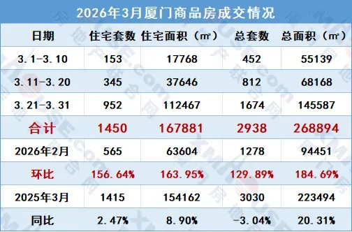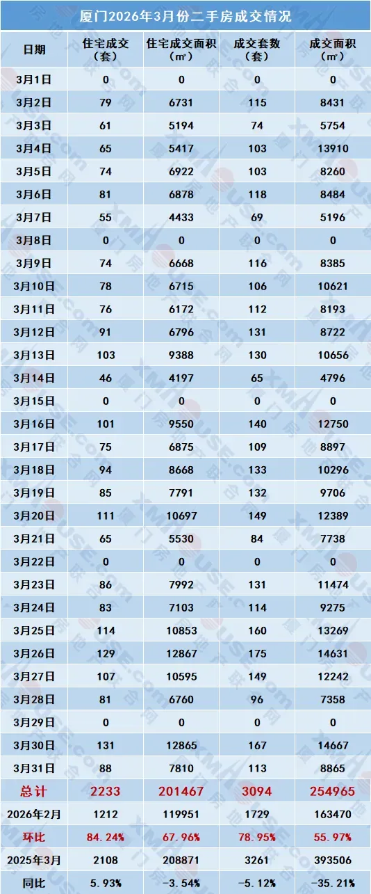 二手房稳步复苏,成交套数环比增长84%,市场活跃度显著提升。根据数据显示,2026年3月厦门二手房成交3094套,成交面积254965㎡。