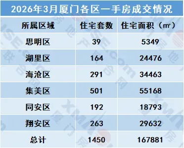 根据数据统计,2026年3月厦门全市新建商品房成交2938套,成交面积达268894㎡。 其中,一手住宅成交1450套,环比上涨156.64%,同比上涨2.47%;成交面积63604㎡,环比上涨163.95%,同比上涨8.9%。在成交量上,集美区以501套占据厦门六区成交头把交椅,遥遥领先;海沧区以291套位列第二,翔安区以263套位列第三,其他区域为同安区192套,湖里区164套,思明区39套。