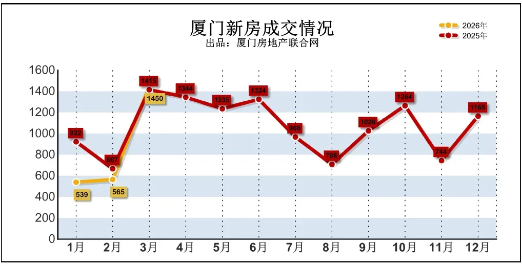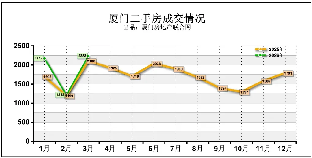 步入3月,厦门二手房市场交易活跃度显著提升,成交量再度冲破2千套大关,市场呈现稳健复苏态势。房价方面,中指研究院数据显示,2026年3月,百城二手住宅均价为12792元/平方米,环比下跌0.34%,跌幅较上月收窄0.2个百分点,已连续第3个月收窄;同比下跌8.55%。