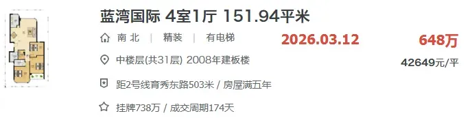 岛内蓝湾国际一套见面约151.94㎡的4室户型,最新的成交总价为648万,成交单价划到42649元/㎡。