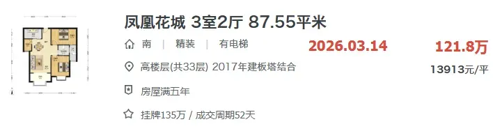 集美的凤凰花城,近期一套建面约87.55屏幕的3室户型,以总价121.8万,单价13913元/㎡成交。
