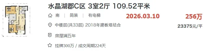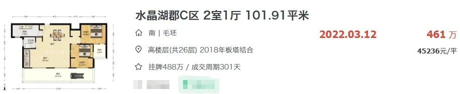 水晶湖郡C区的一套建面约109.52㎡的3室户型,最新的成交单价为23375元/㎡。在高峰期的时候,小区另一套建面约101.91㎡的3室房源,成交单价为45236元/㎡。