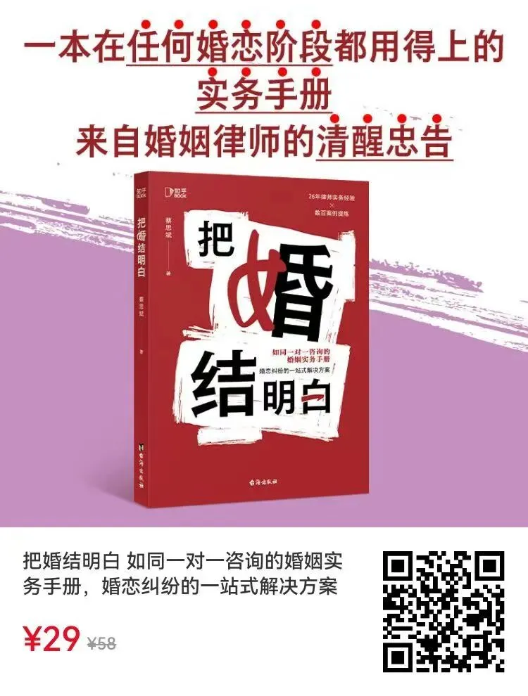 对婚恋问题有疑惑?下方可扫码购入蔡思斌律师著,婚恋纠纷的“避坑指南”与“自救手册”——《把婚结明白》,详细介绍见:给所有踏入亲密关系的人,一份清醒的忠告~