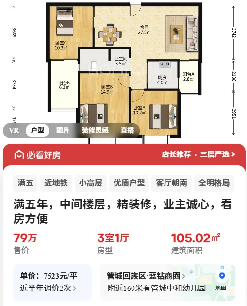 正商蓝钻:主流单价在7500-9500元/㎡,小区2007-2009年竣工,紧邻5号线地铁口,出行便捷,配套成熟,户型涵盖97-147㎡,总价多在73-140万之间,刚需首付15万左右即可入手,性价比拉满。小区年代稍久,绿化欠佳,但胜在配套落地、价格友好,且目前二手房挂牌价可谈空间极大,议价后往往能有意外惊喜,是刚需捡漏的首选之一。