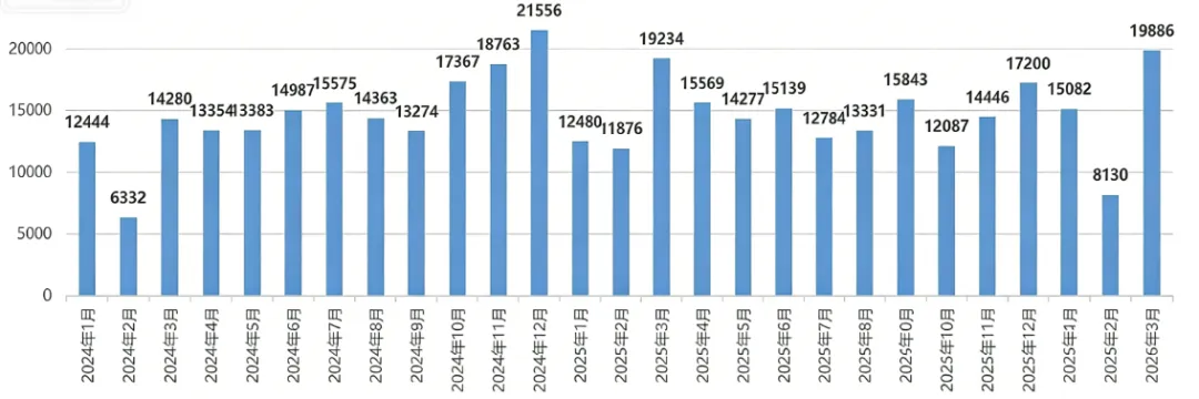 2024年1月-2026年3月北京二手房住宅网签数量。