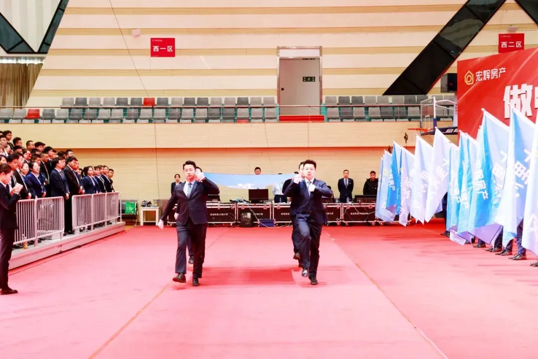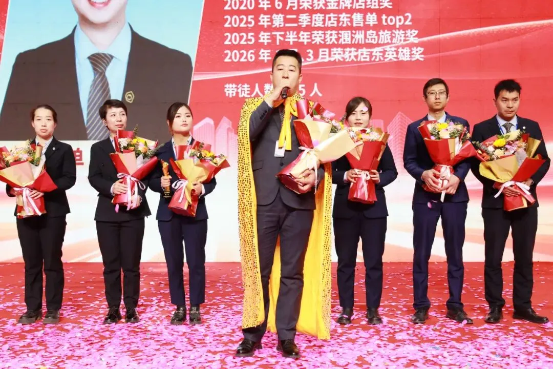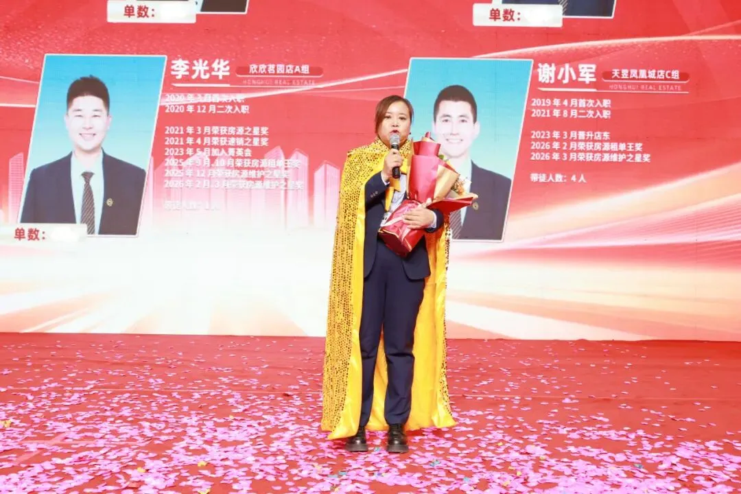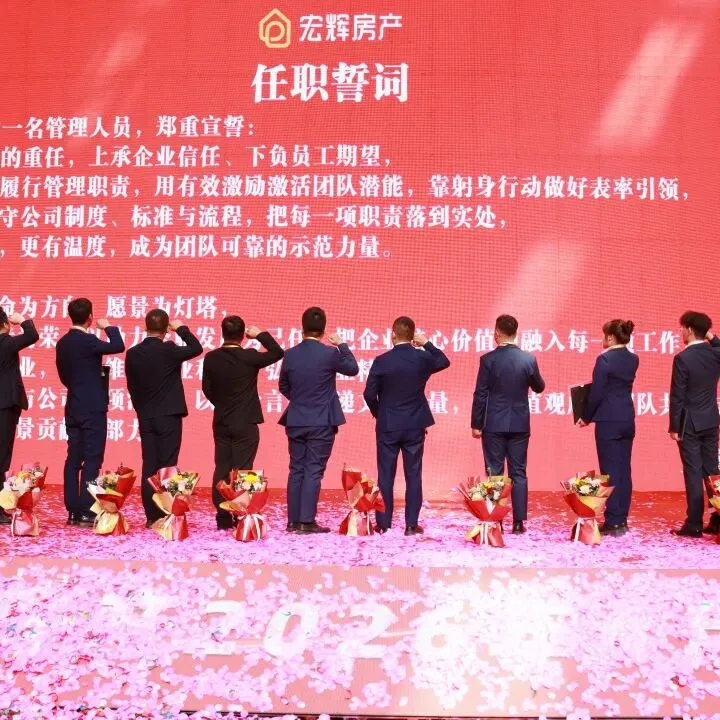 大会最后,集团总裁杨成虎先生上台致辞。杨总首先回顾了三月全体宏辉人的拼搏与成绩,并向每一位在一线奔波、在深夜坚守、在细节中打磨服务的伙伴表示感谢。他说:“三月的每一张喜报,都不是写出来的,是干出来的”,随后,杨总提出“七星服务保障·八项服务承诺”的服务标准。他强调,这不仅是挂在墙上的口号,而是从客户来电的第一声问候,到签约交付的最后一盏灯,每一个环节都要对标的行动准则。“客户把安家的信任交给我们,我们就要用严格的标准、极具品质的服务回应”。每一位宏辉人都要把自己当作客户感受品牌的唯一窗口,最后,杨总号召全员:四月,不设上限,持续攀高。用每一天的精进,兑现越己为峰的誓言,让客户感受到我们的服务,让市场感受到我们的回应!