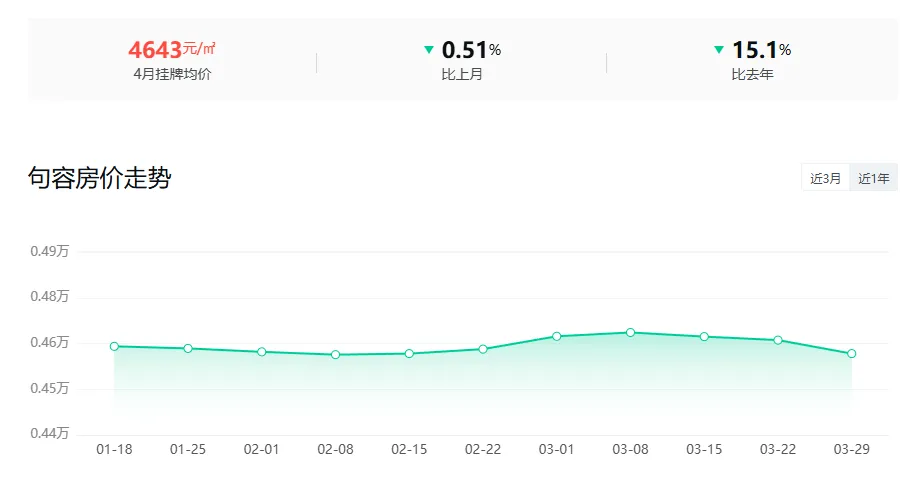 句容市3月二手房均价4643元/m²,环比上月上涨0.51%,同比去年同期下降15.1%