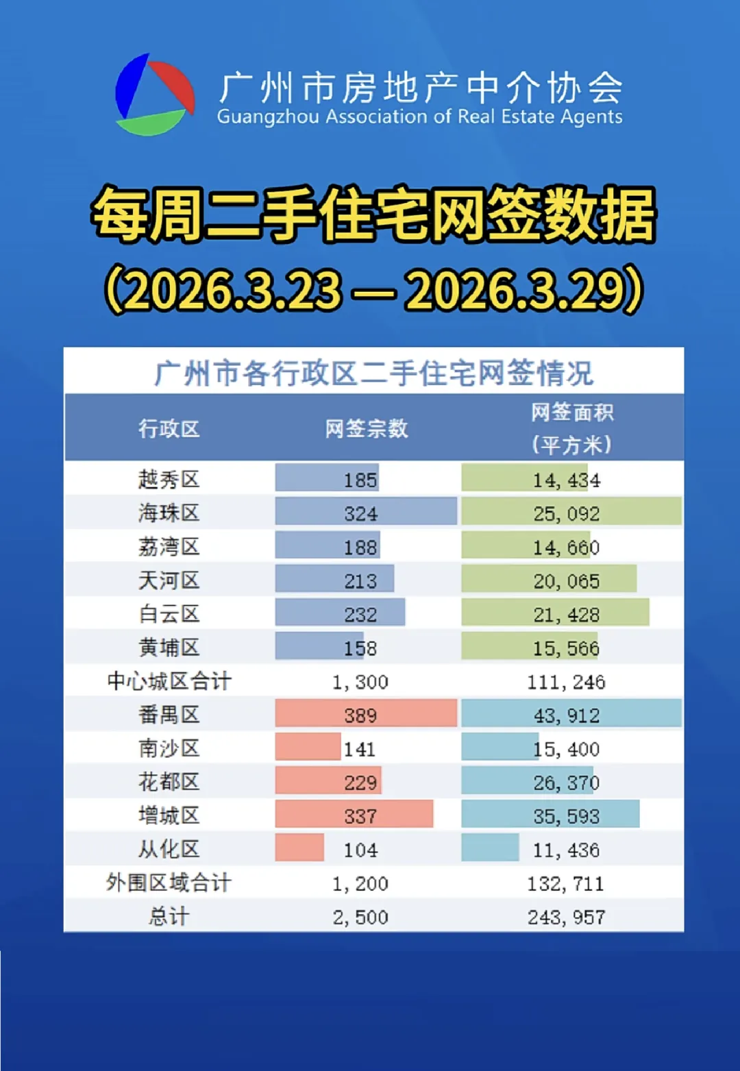 2026年3月23日~2026年3月29日(数据来源:广州市房地产中介协会),广州存量二手房累计网签2500 套,网签面积 243957㎡,比上周减少 89套,环比降幅(按宗数)3.56%,各行政区成交量各有涨跌。