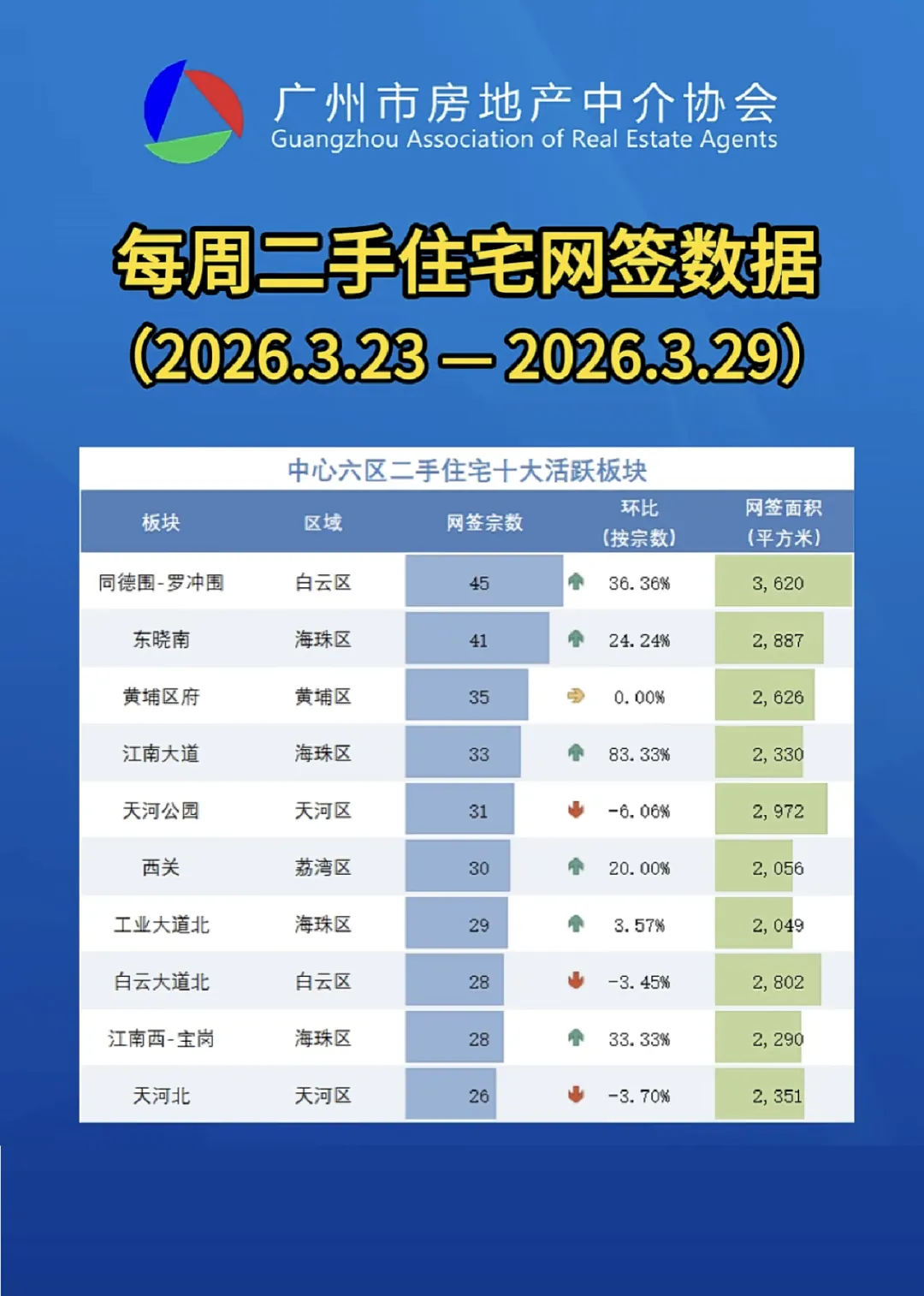 2026年3月23日~2026年3月29日(数据来源:广州市房地产中介协会),部分热点版块网签宗数大部分有所上涨。